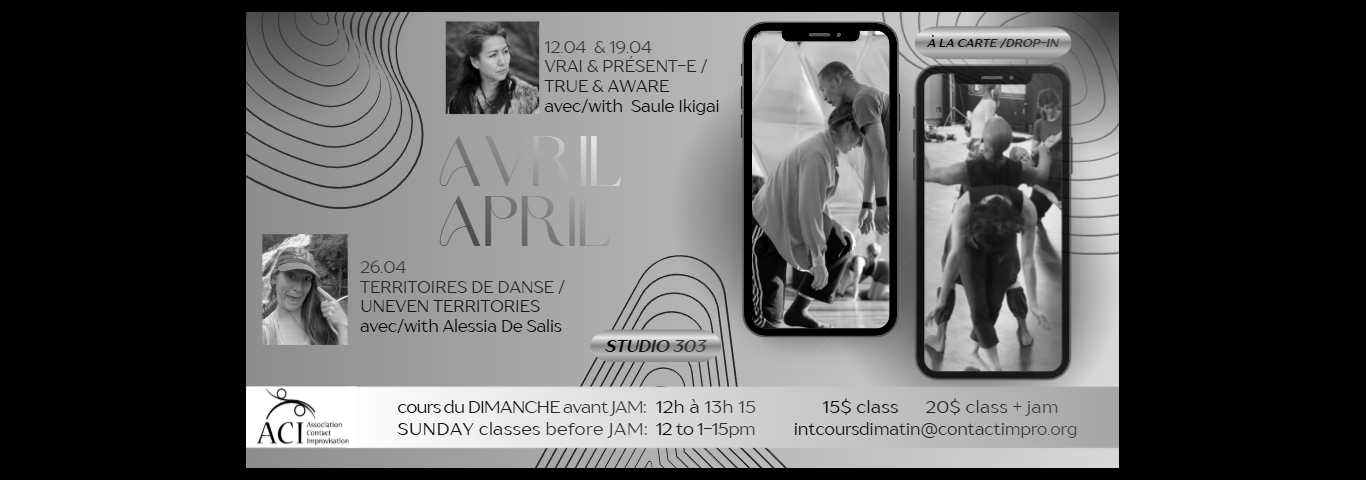 Par où commencer ? La meilleure introduction au Contact Improvisation est de participer à une classe (voir sur notre site web) ou d’être introduit par une personne à l’accueil du jam du dimanche.